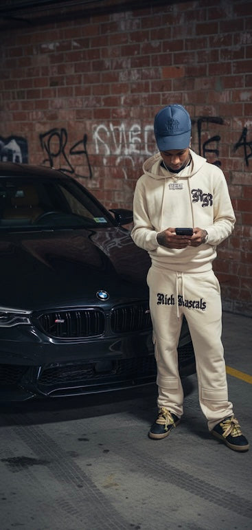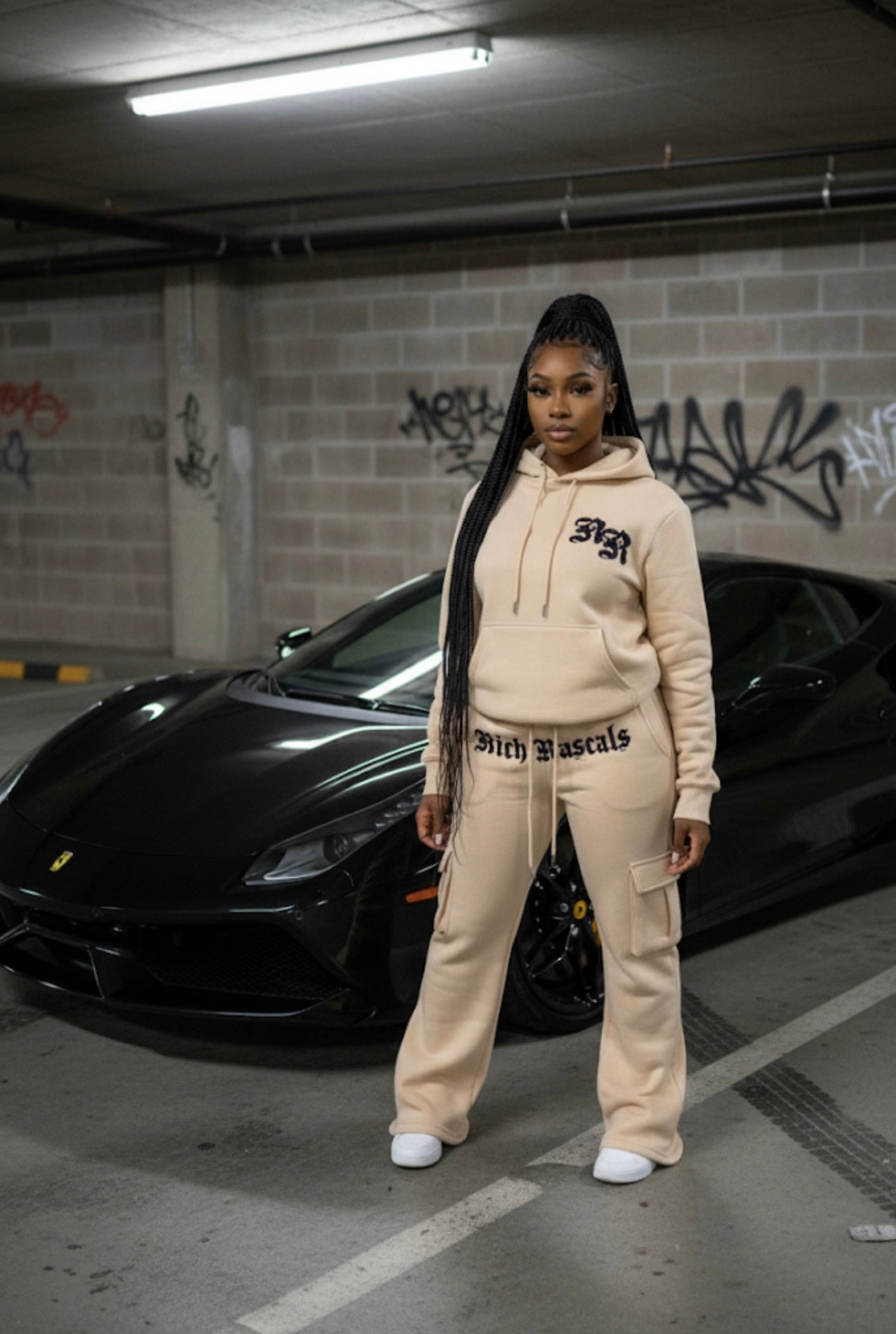 This set features a beige jogger suit with bold "Rich Rascals" branding in brown gothic-style font. The hoodie has a sleek, modern design with the "RR" initials on the chest, and the matching stacked pants carry the full brand name across the back. Perfect for streetwear enthusiasts who enjoy comfortable yet stylish fits that make a statement.