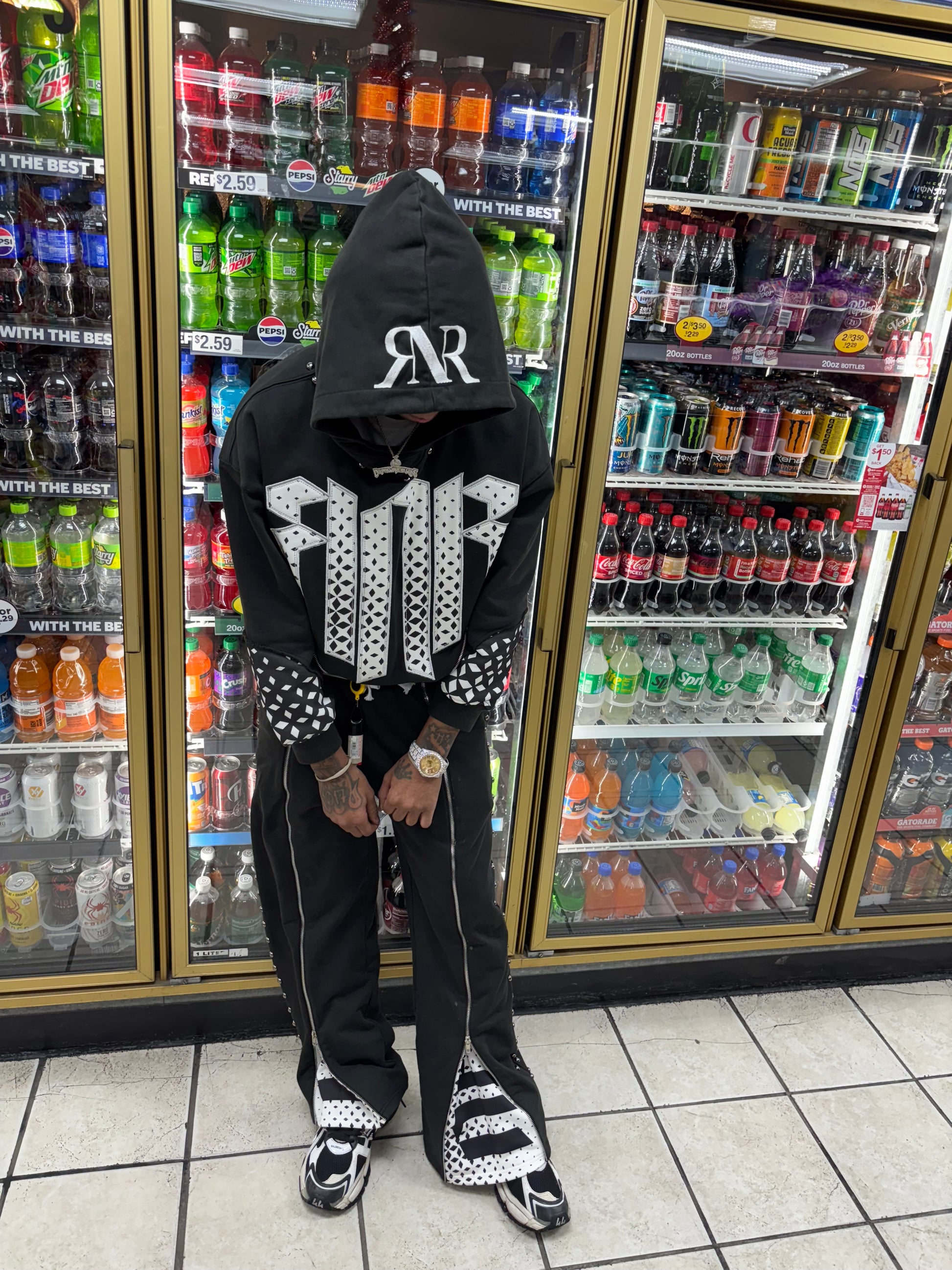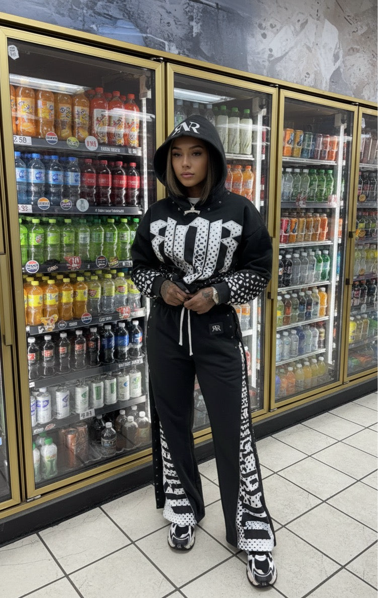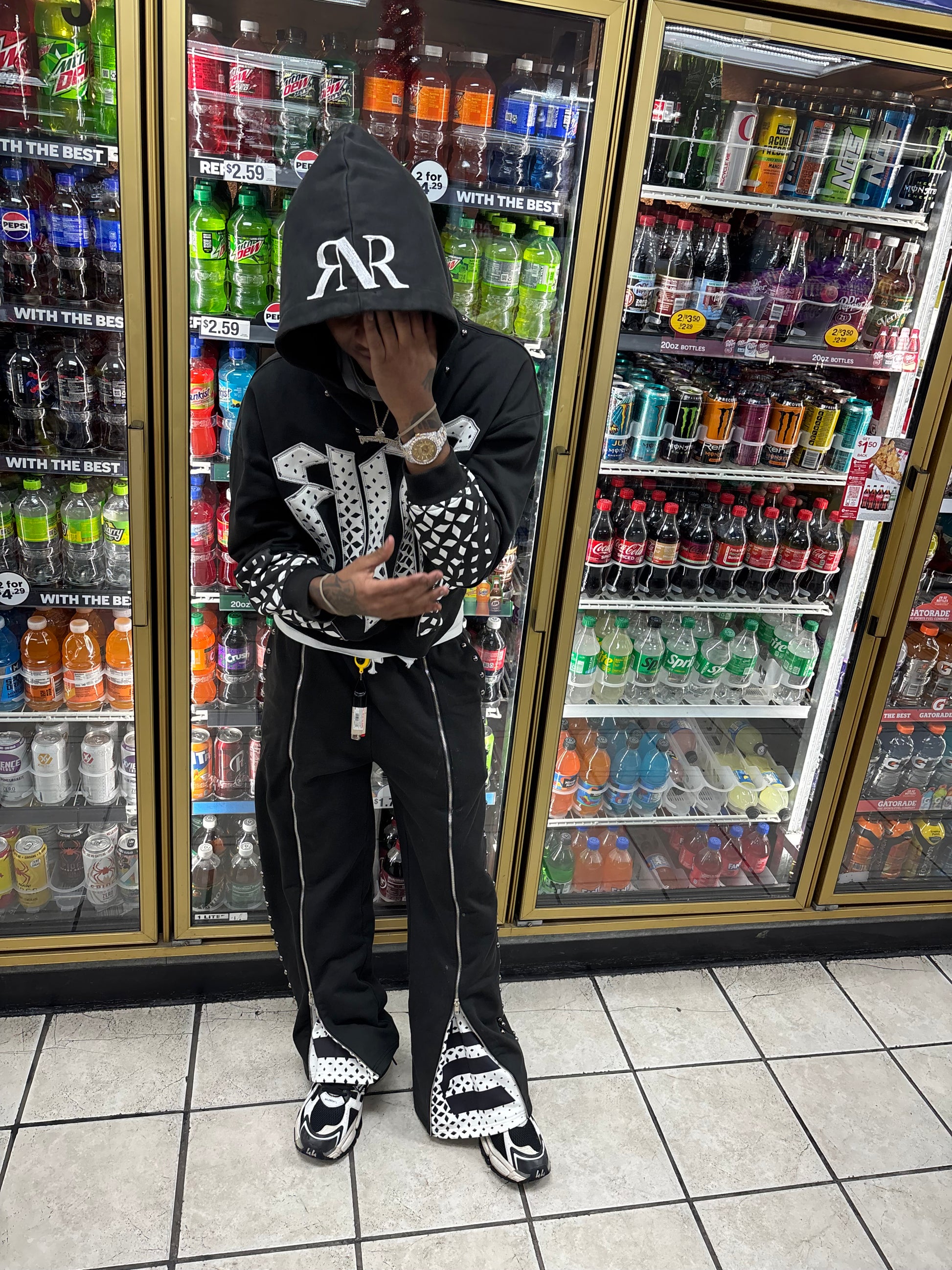 Elevate your streetwear game with this edgy black and white set from *Rich Runner Necessities*. The matching pants bring the whole look together with a wide-leg cut and striking silver geometric patterns, making this set perfect for a statement look. Functional zippers & drawstrings with studded accents enhance its unique urban style, blending comfort and high-fashion vibes seamlessly.